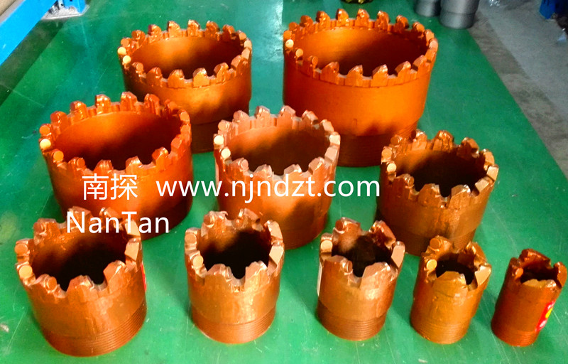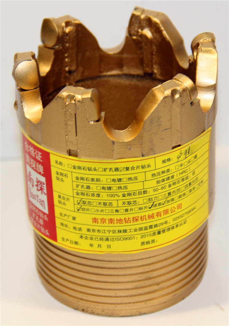 巖心管(單管)取芯復合片鉆頭按照復合片的種類又可以分:普通型復合片鉆頭、加強型復合片鉆頭、球面復合片鉆頭、超強型復合片鉆頭、盔齒型復合片鉆頭、切片復合片鉆頭、小牙復合片鉆頭、小牙螺紋復合片鉆頭、菠蘿復合片鉆頭、外肋骨復合片鉆頭、無內(nèi)徑跟管復合片鉆頭等許多種,以便于滿足不同地層、砂礫石、巖石的取芯需求。該種鉆頭穩(wěn)定性好,具有使用壽命長、鉆進效率高、低壓中速鉆進、保徑效果好、使用范圍廣和具有優(yōu)越的性價比等特點,可廣泛應用于地質(zhì)勘探、煤田開采、水利水電施工(水井開發(fā))、地熱孔、公路、鐵路、建筑施工建設(shè)的巖石鉆進及巖石抽心取樣驗樁。